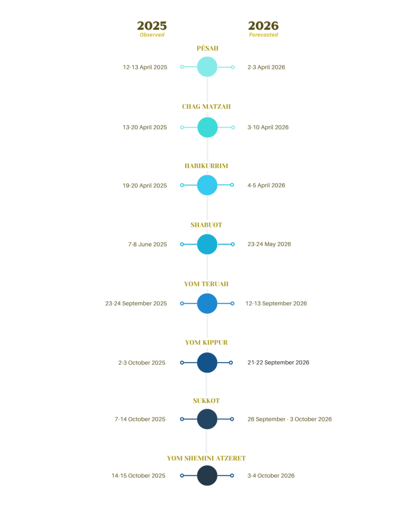 The appointed times of 𐤉𐤄𐤅𐤄 are annual celebrations which the Almighty gave to His people, as set apart times of worship, celebration, rejuvenation, and study of His Word, for the spiritual edification of the Body of Messiah. These appointed times have a much deeper prophetic purpose, as explained in the related article: Prophetic Calendar. Below is a graphic showing the dates celebrated during 2025 as well as the forecasted dates for 2026.